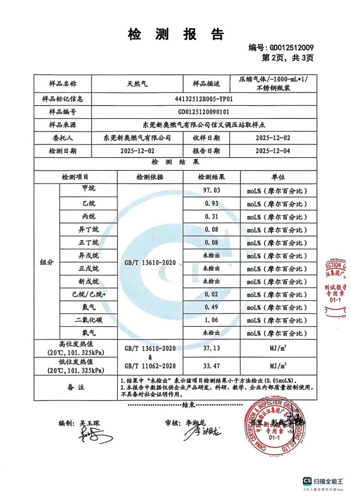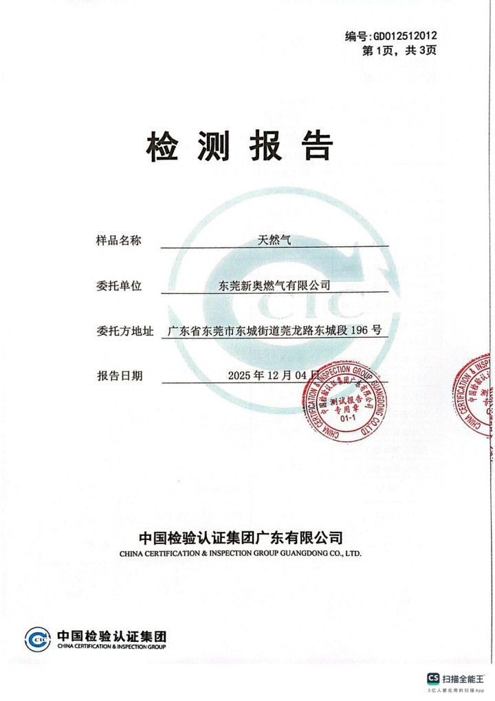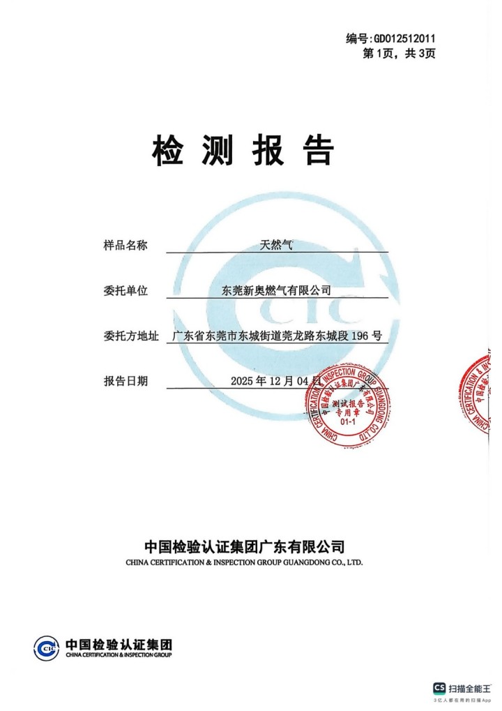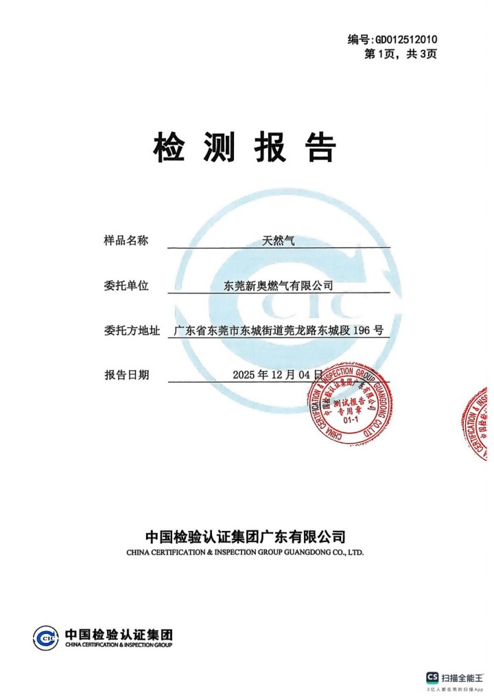 東莞新奧2025年12月天然氣氣質報告公示