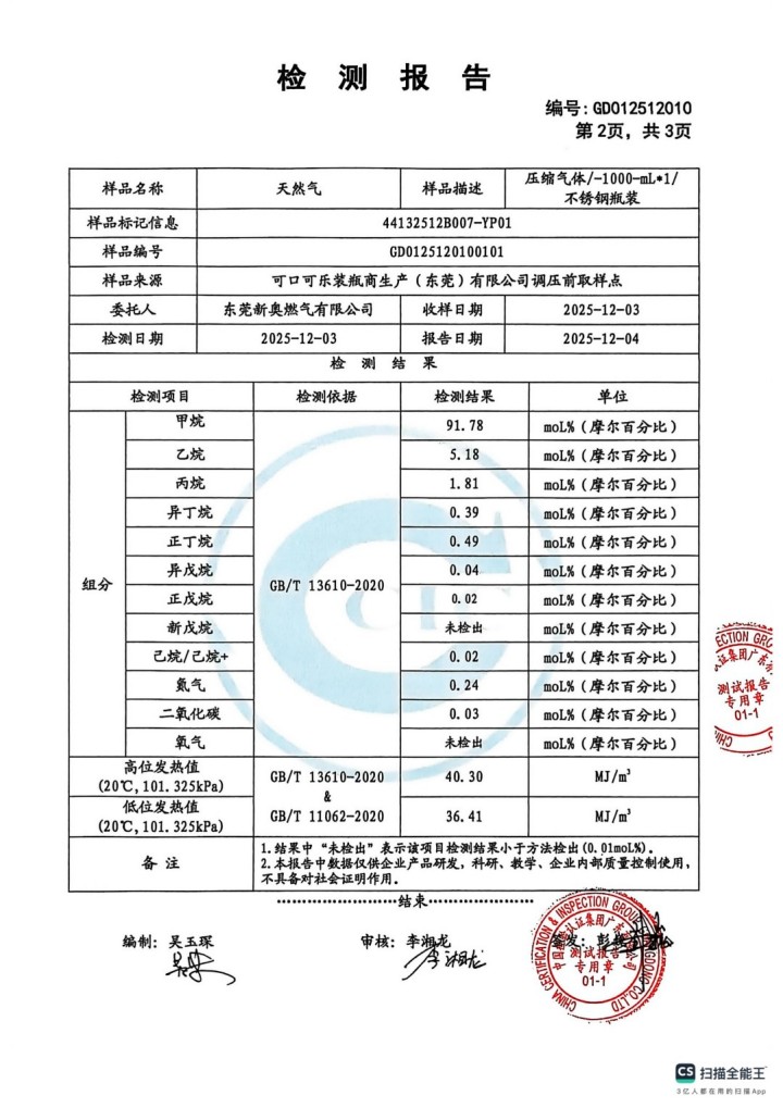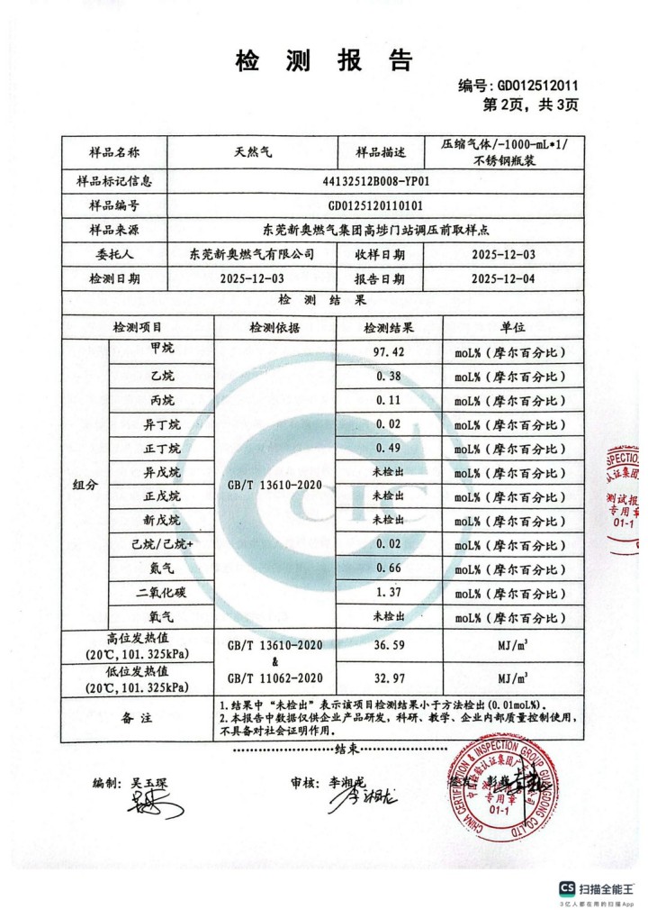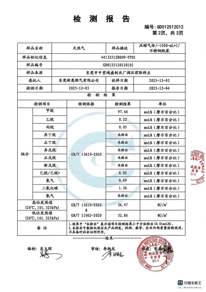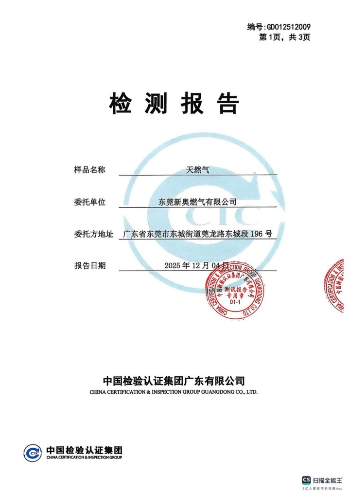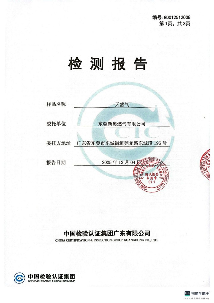 東莞新奧2025年12月天然氣氣質報告公示
