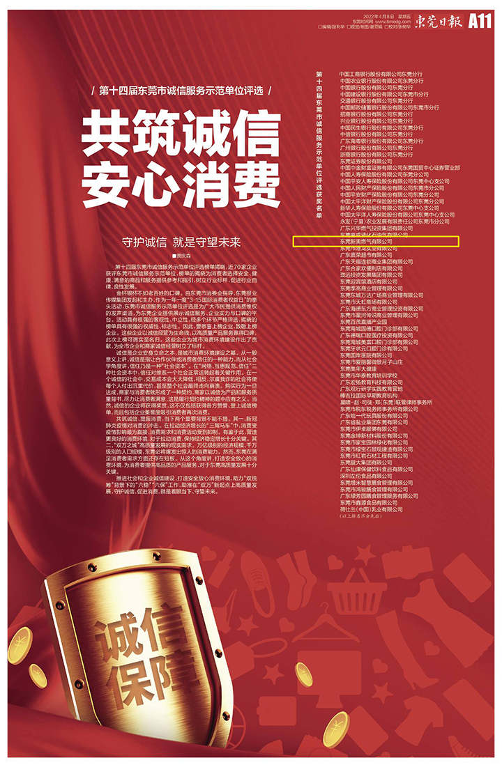 4月8日,由東莞市消委會指導、東莞報業傳媒集團發起和主辦的第十四屆東莞市誠信服務示范單位評選榜單揭曉,東莞新奧憑借多年來大力推廣清潔能源贏得的良好社會口碑,榮獲“東莞市誠信服務示范單位”稱號。