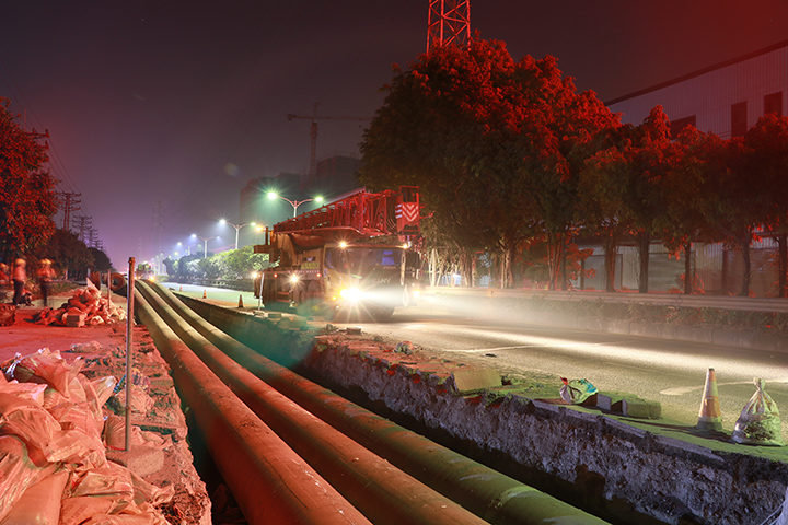 11月23日晚12點(diǎn),“北王路(高埗門站-廟水路段)高壓管網(wǎng)工程”施工現(xiàn)場(chǎng),定向穿越前的準(zhǔn)備工作正在緊張進(jìn)行中。現(xiàn)場(chǎng)管理員陳賜銘已連續(xù)工作了12個(gè)小時(shí),但真正的戰(zhàn)斗,直到穿越鉆機(jī)啟動(dòng)的剎那才算開(kāi)始,待管道在地底穿行0.7公里后成功出土?xí)r,才算勝利。