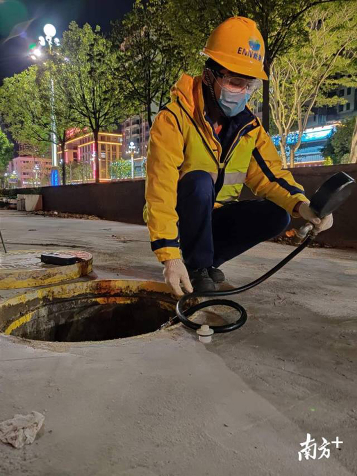 26日,在需置換通氣的小區門口,兩人穿上重重防護裝備,套上防護服與雨靴,戴上護目鏡、口罩、橡膠手套等。東莞新奧燃氣CEO吳曉菁、黨委書記李明華等人也早早來到了現場,為他們鼓舞打氣。